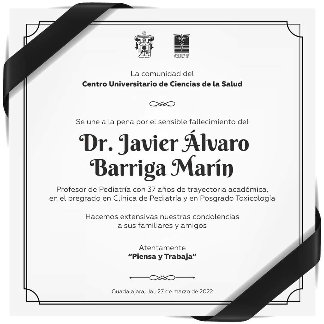 sobre La Comunidad del CUCS se une a la pena por el sensible fallecimiento del Dr. Javier Álvaro Barriga Marín, profesor de Pediatría con 37 años de trayectoria académica en el pregrado en Clínica de Pediatría y en posgrado Toxicología.