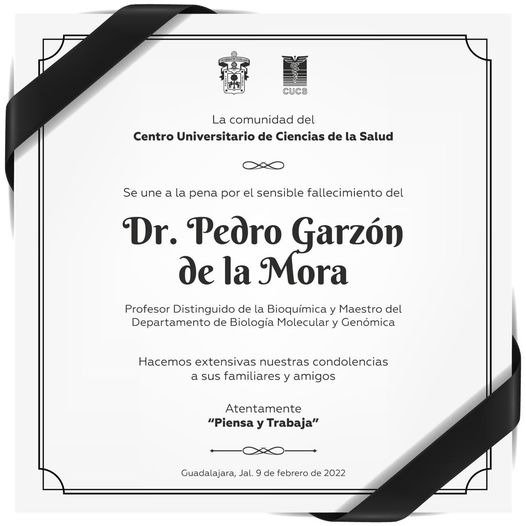 sobre La comunidad del CUCS se une a la pena por el sensible fallecimiento de la Dr. Pedro Garzón de la Mora, Profesor Distinguido de la Bioquímica y Maestro del Departamento de Biología Molecular y Genómica