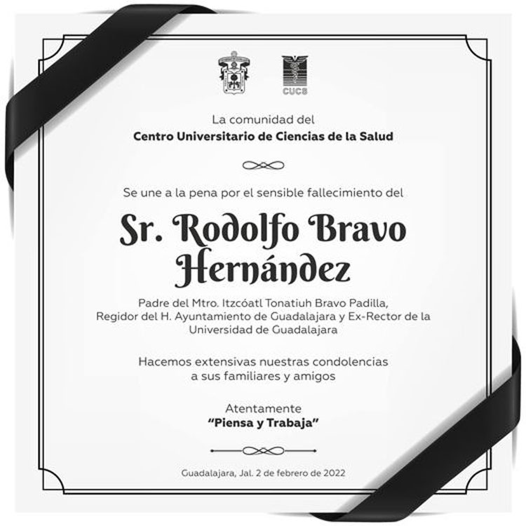 sobre La comunidad del CUCS se une a la pena por el sensible fallecimiento del Sr. Rodolfo Bravo Hernández, Padre del Mtro. Itzcóatl Tonatiuh Bravo Padilla