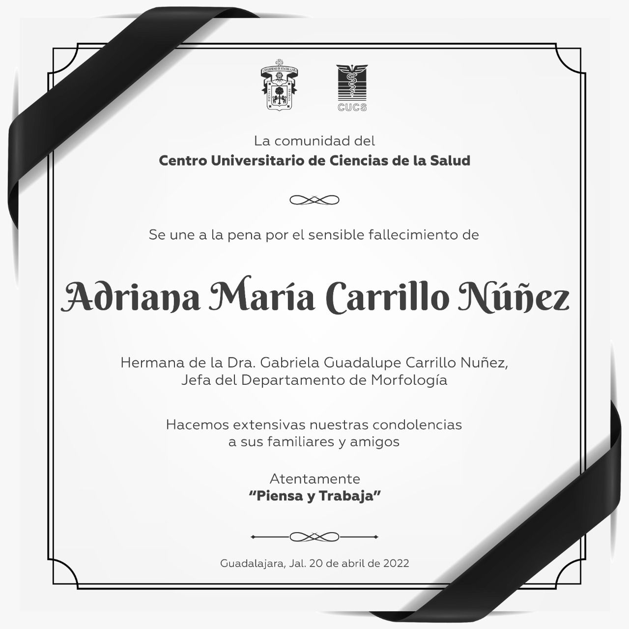 sobre La comunidad del Centro Universitario de Ciencias de la Salud se une a la pena por el sensible fallecimiento de Adriana María Carrillo Núñez; hermana de la Dra. Gabriela Guadalupe Carrillo Núñez, Jefa del Departamento de Morfología.
