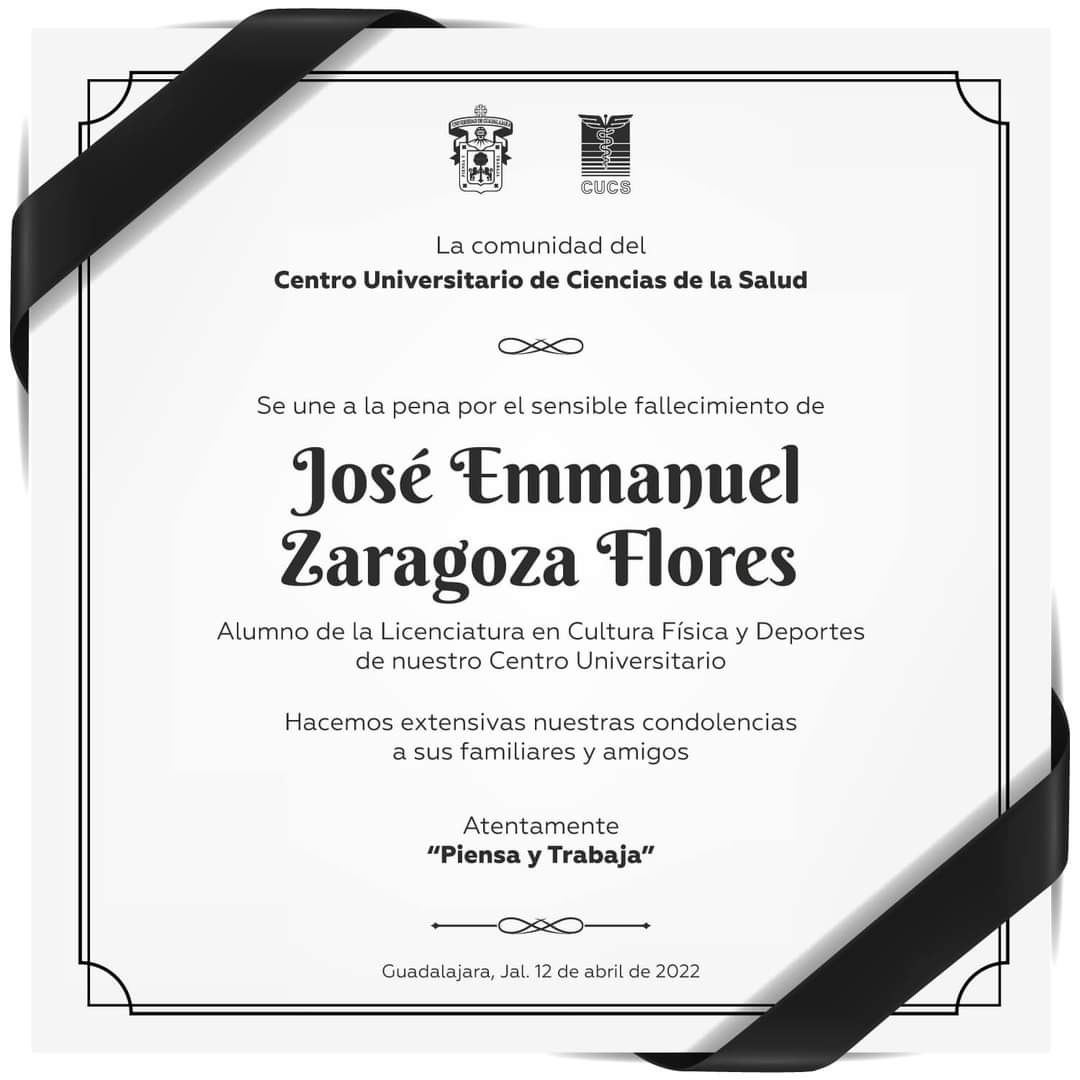 sobre La comunidad del Centro Universitario de Ciencias de la Salud, se une a la pena por el sensible fallecimiento de José Emmanuel Zaragoza Flores, alumno de la Licenciatura en Cultura Física y Deportes de nuestro Centro Universitario.
